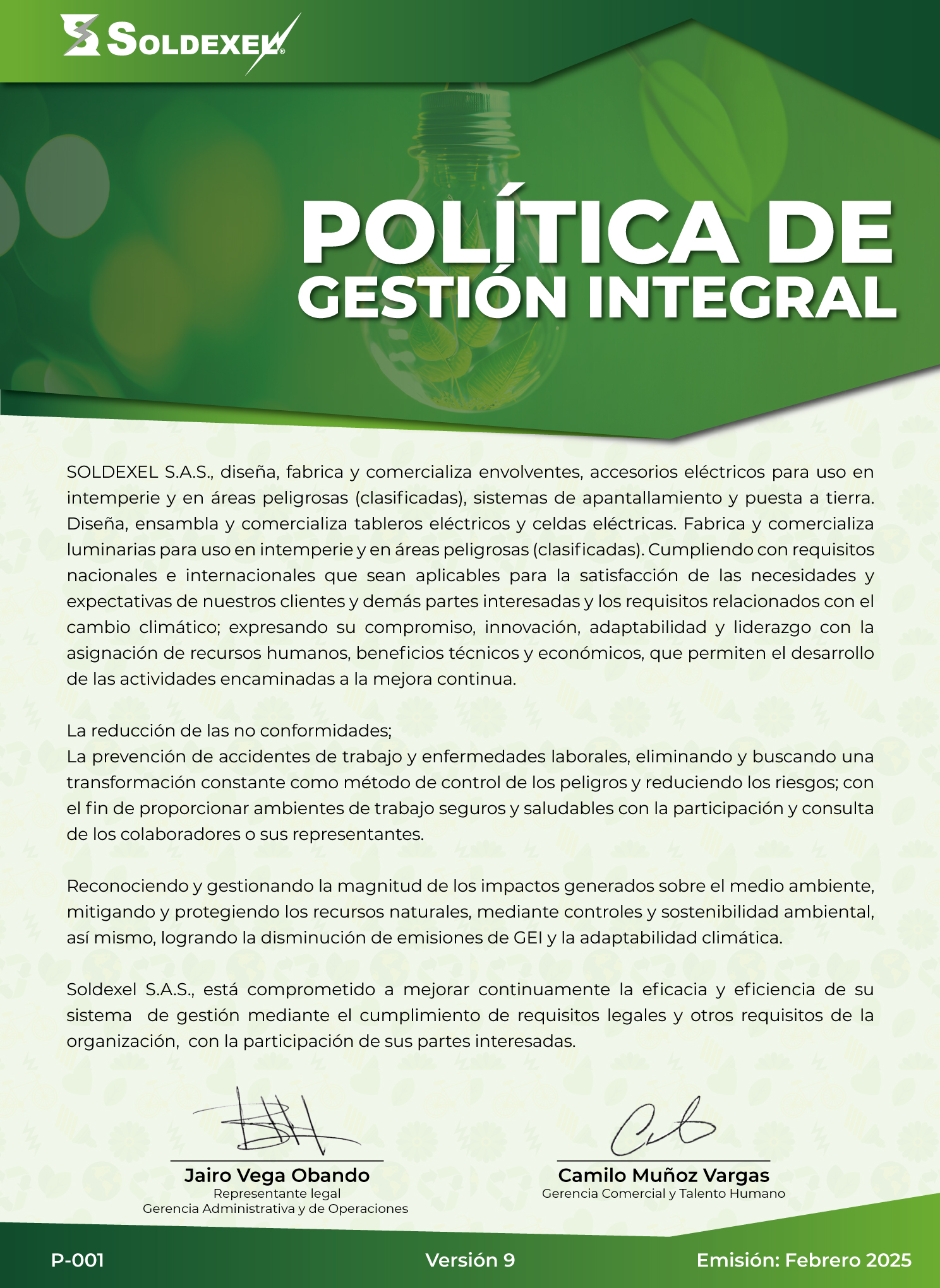 SOLDEXEL se compromete a garantizar la calidad y seguridad de sus productos, así como a proteger el medio ambiente